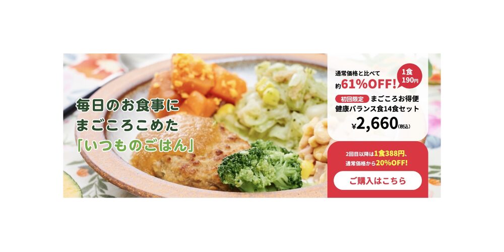 • 最安狙い:まごころケア食(388円/食目安)。送料は1回980円とされるため、配送回数を最適化すると総額を抑えやすいです。
